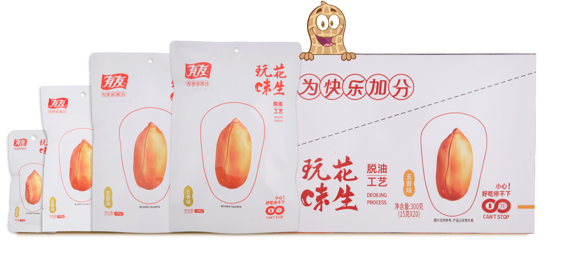有友脱油花生有三种口味,五香味香味醇厚、老少皆宜;香辣味鲜香开胃、层次丰富;蜜辣味辣中回甘、双重享受。无论是商务社交、办公小憩、观赛看球、聚会郊游,随时随地分享起来——为快乐加分!