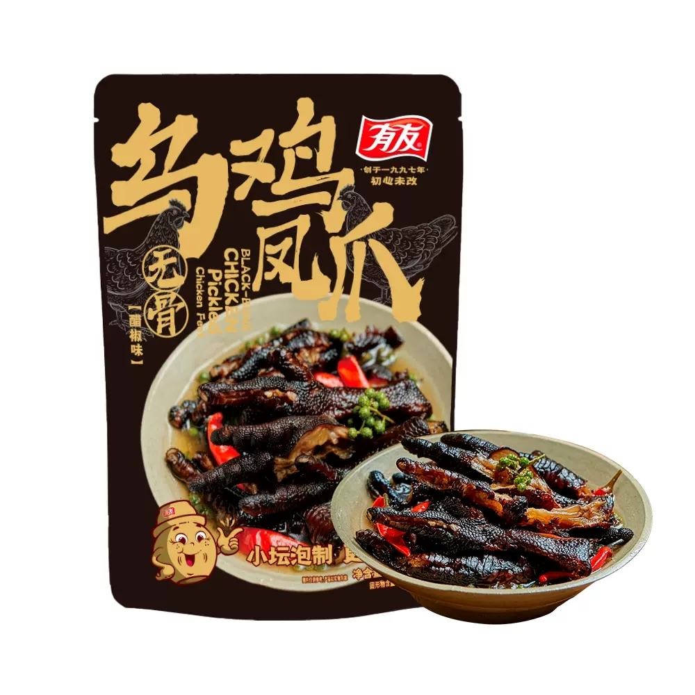 特点:有友采用先去骨后熟化的工艺,增加了去骨难度,加上有友26年积累的控温经验,使无骨凤爪也能有有友泡凤爪微脆的口感。